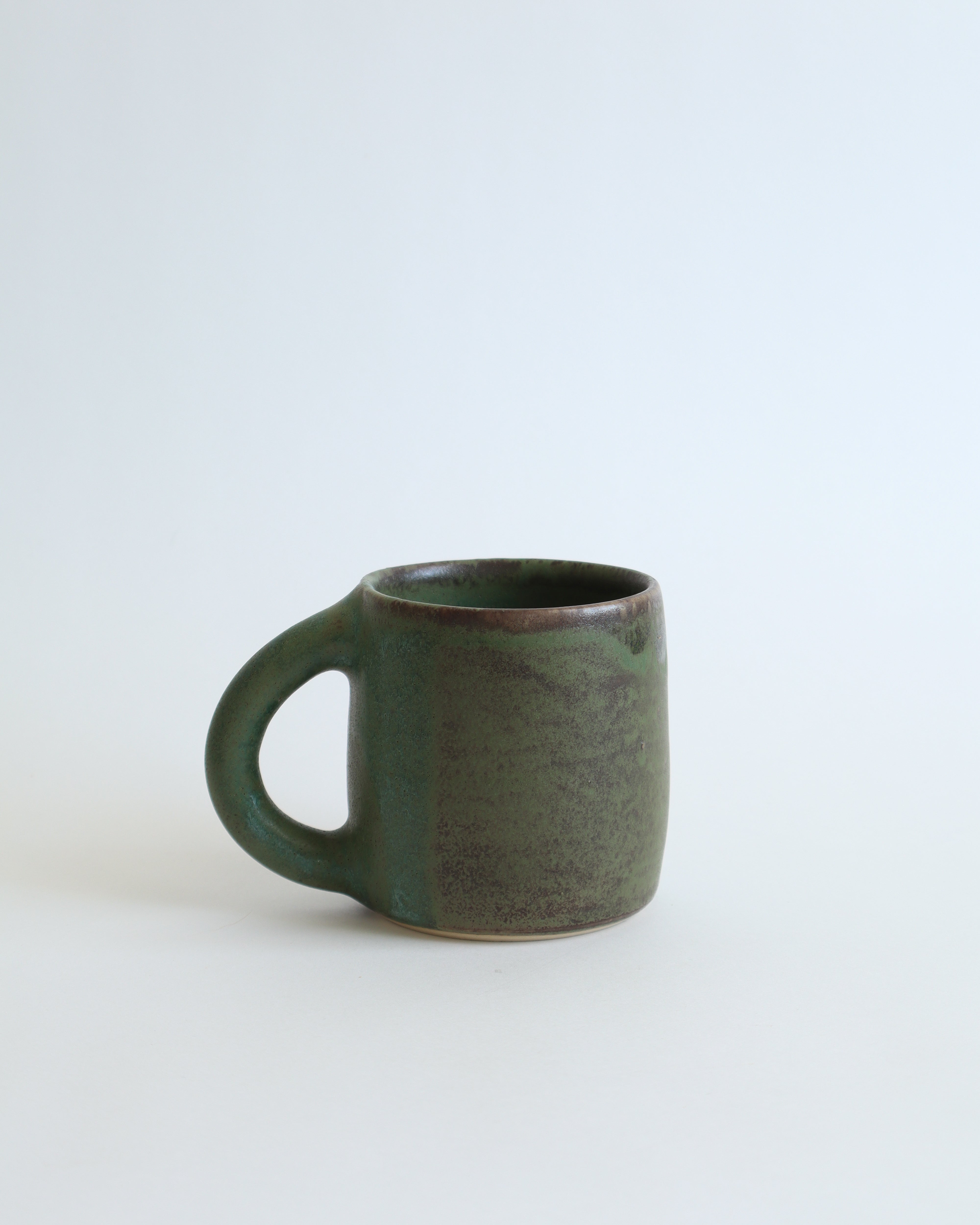 A handmade ceramic mug with a well-proportioned, easy-to-hold handle and a rich green glaze.