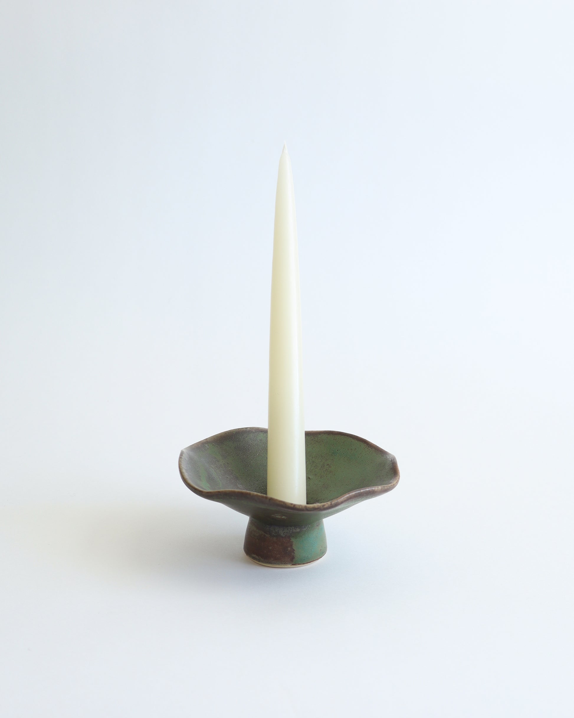 A hand-formed ceramic candle holder with a softly scalloped edge and rich green glaze.