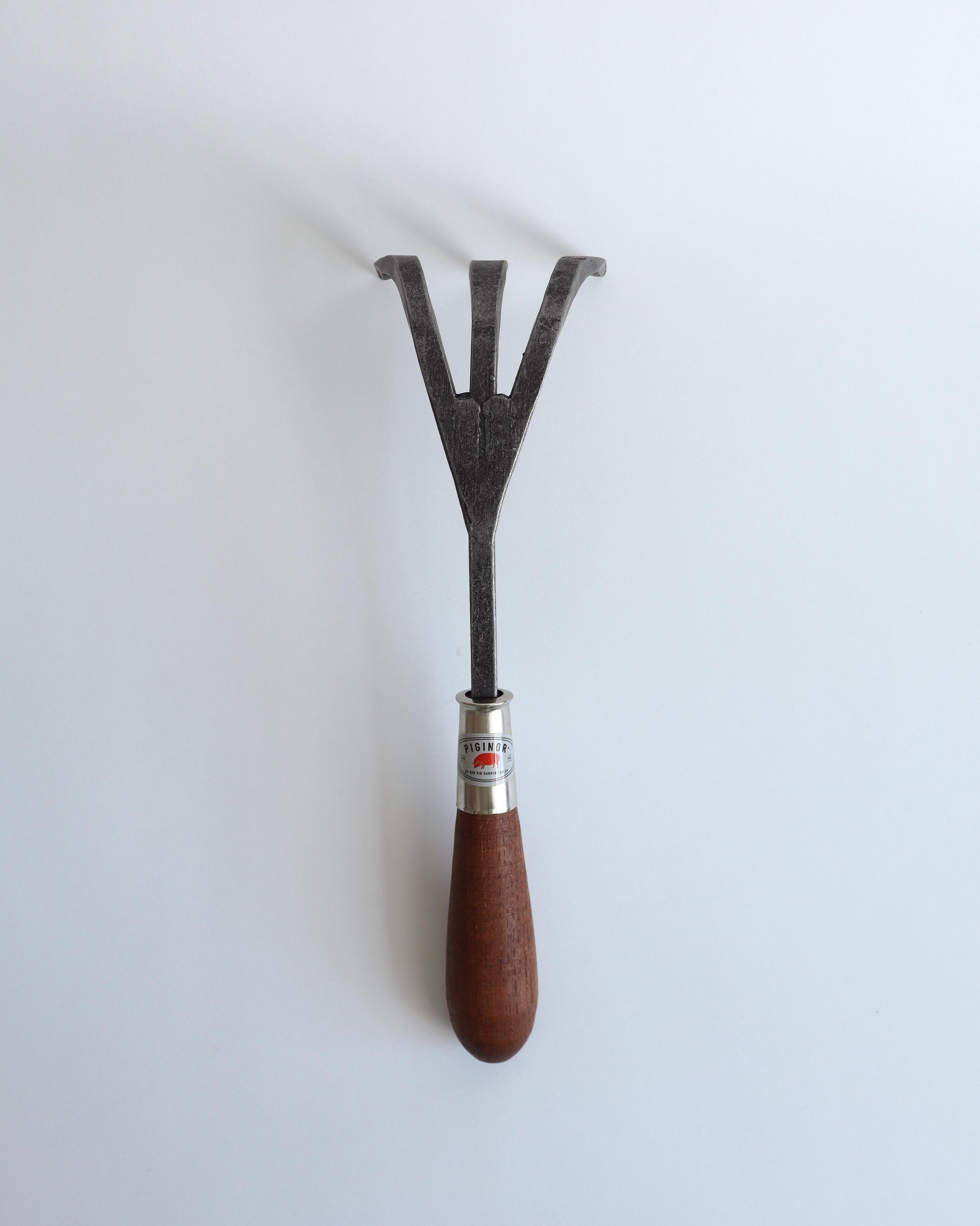 A standard three-tine cultivator designed for loosening soil and working planting beds.