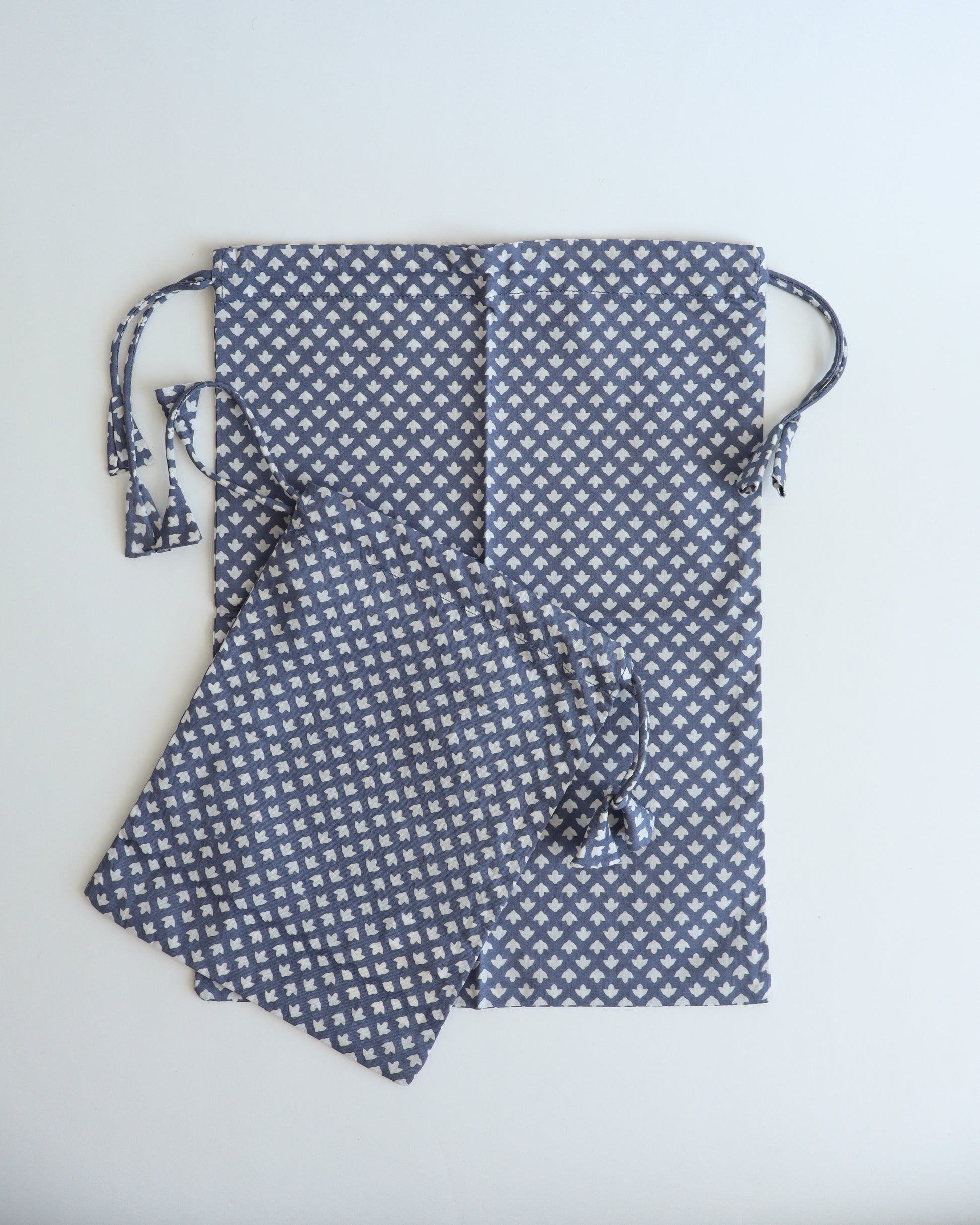 A set of two drawstring bags made from boiled cotton fabric with a hand-printed pattern.
