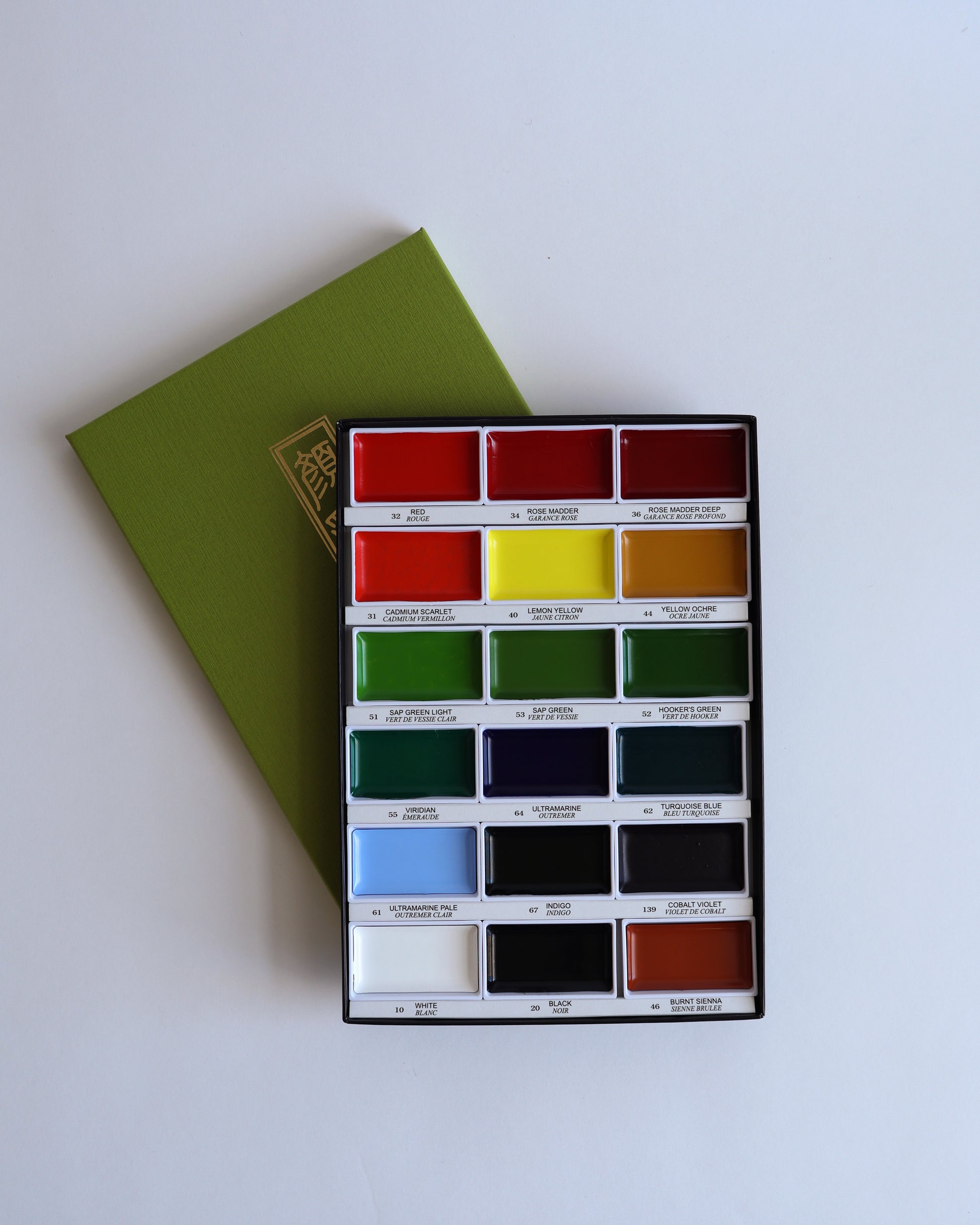 A traditional Japanese watercolor set featuring rich, nature-inspired colors.