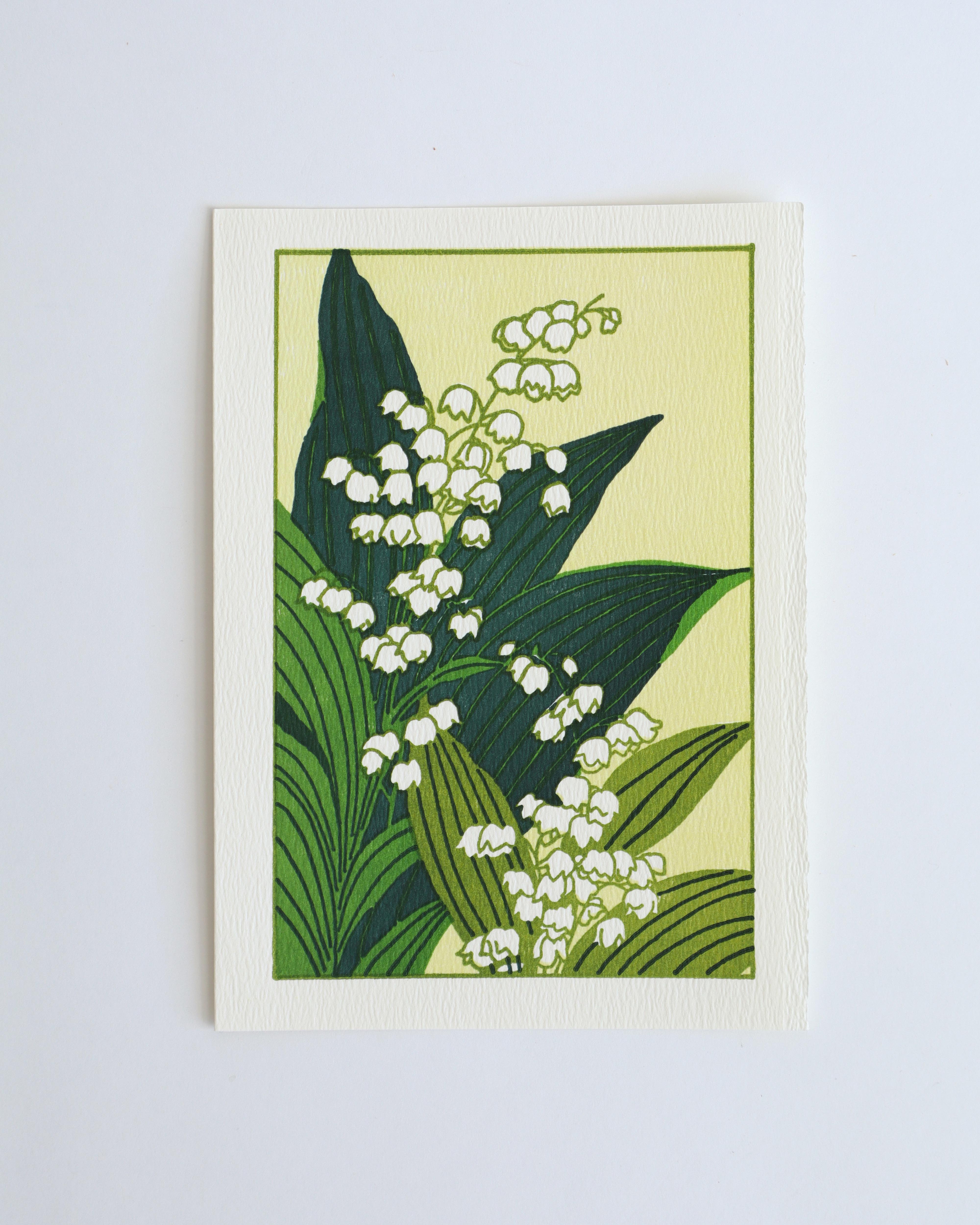 A letterpress-printed greeting card featuring lily of the valley in a classic Arts & Crafts–inspired design.