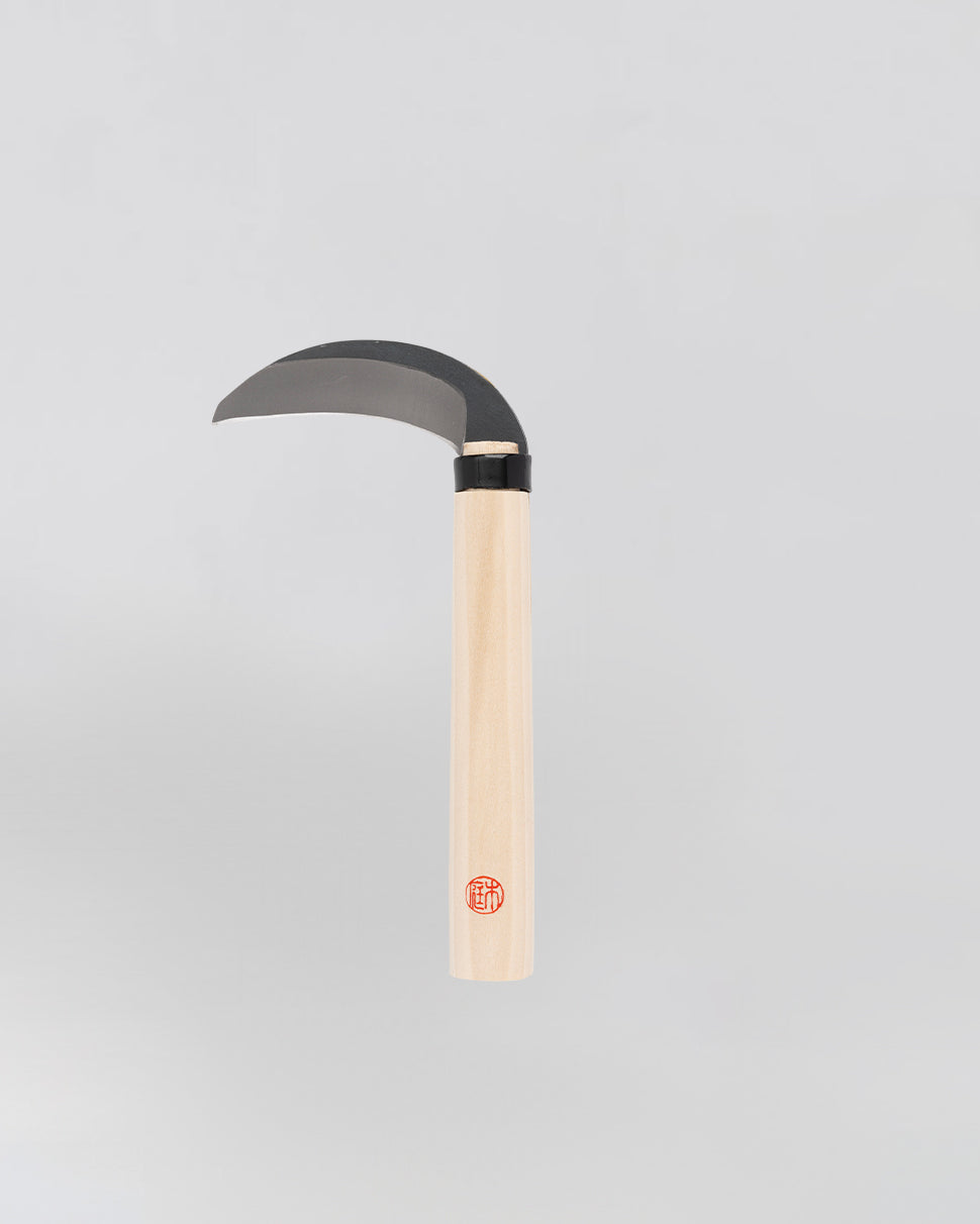 A compact Japanese sickle designed for precise weeding and light harvesting.