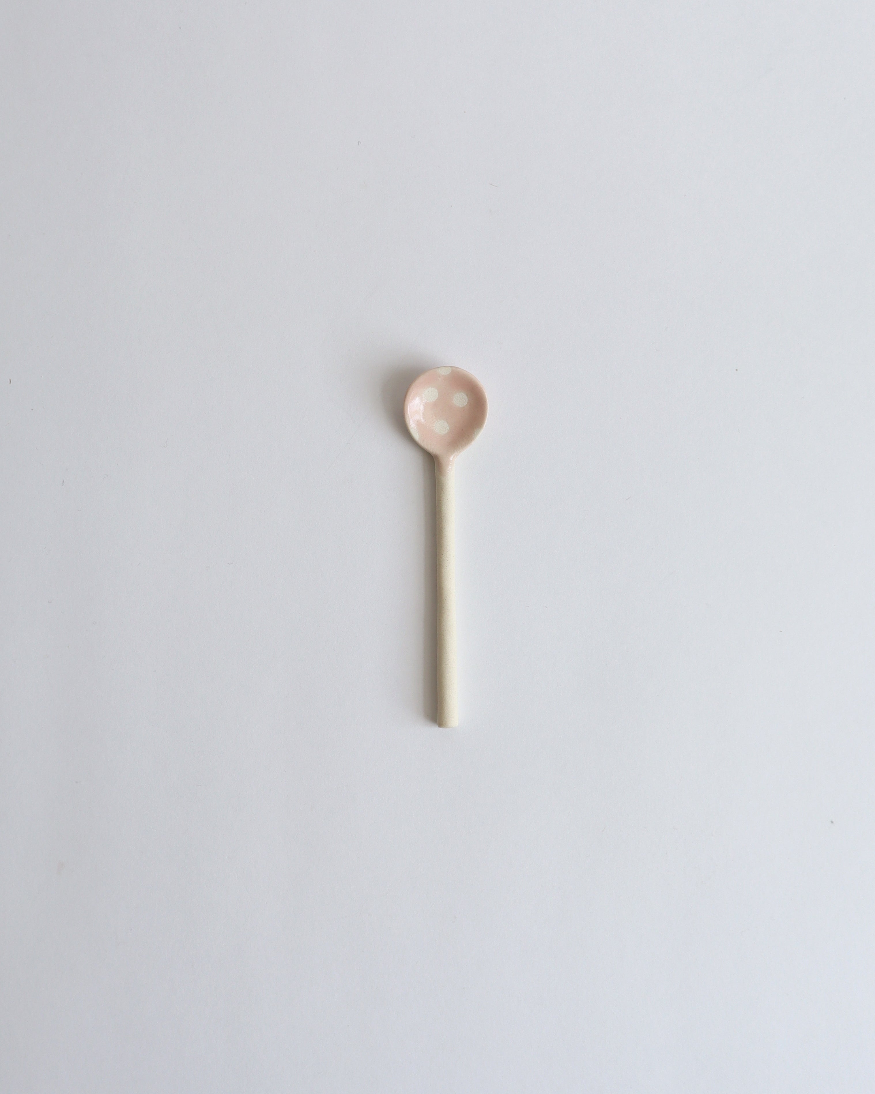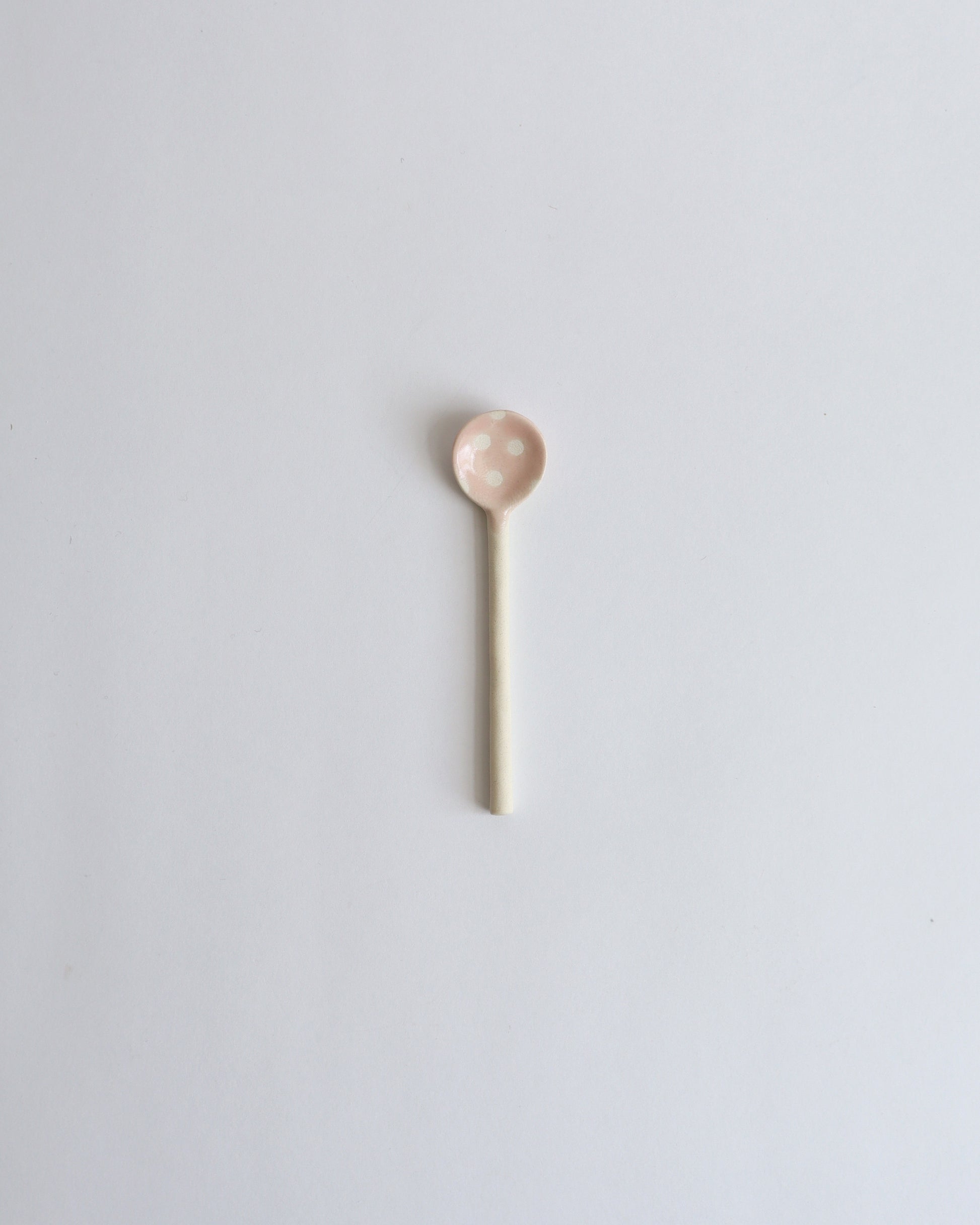 A small ceramic spoon with a hand-painted polka dot pattern.