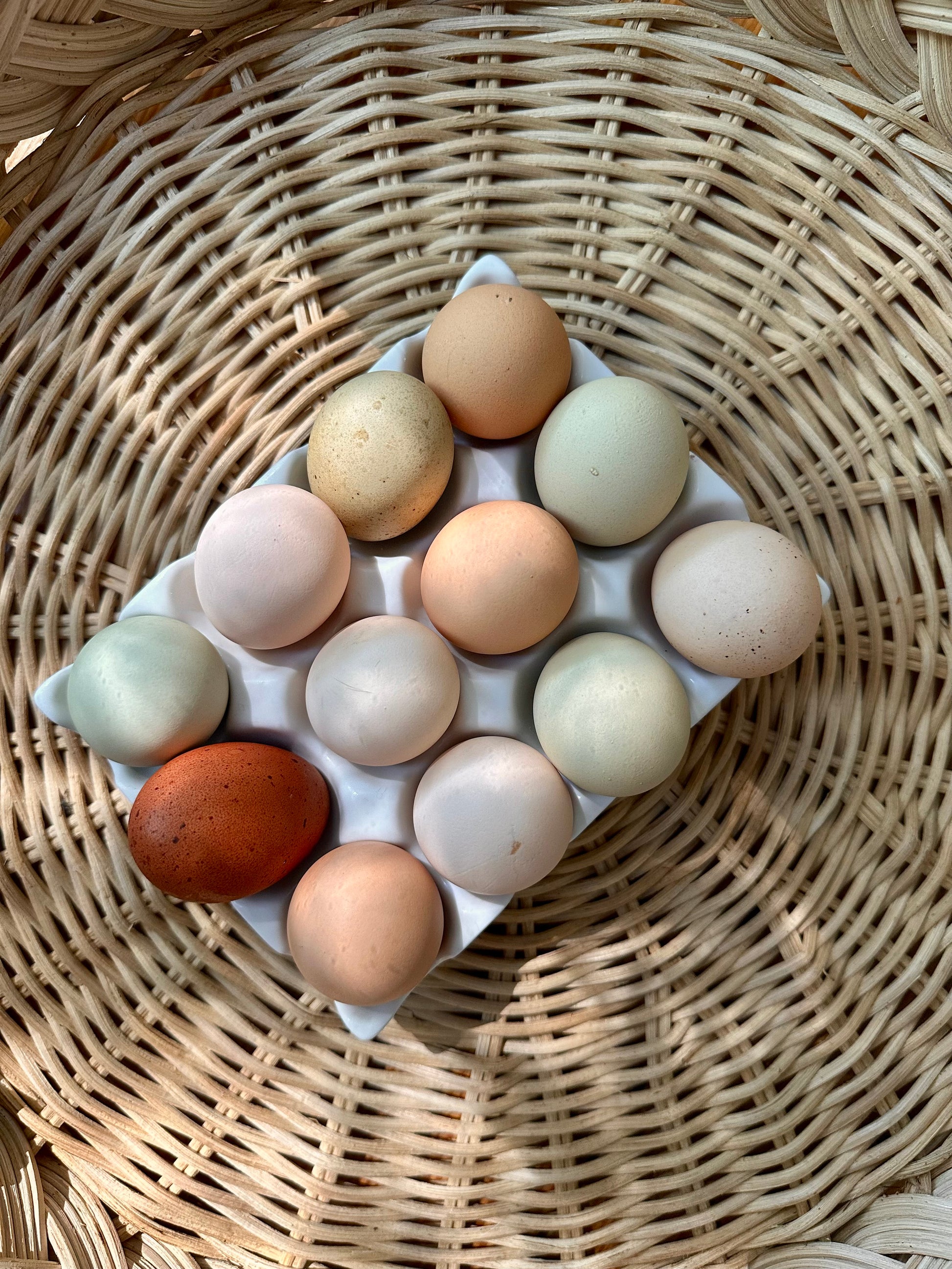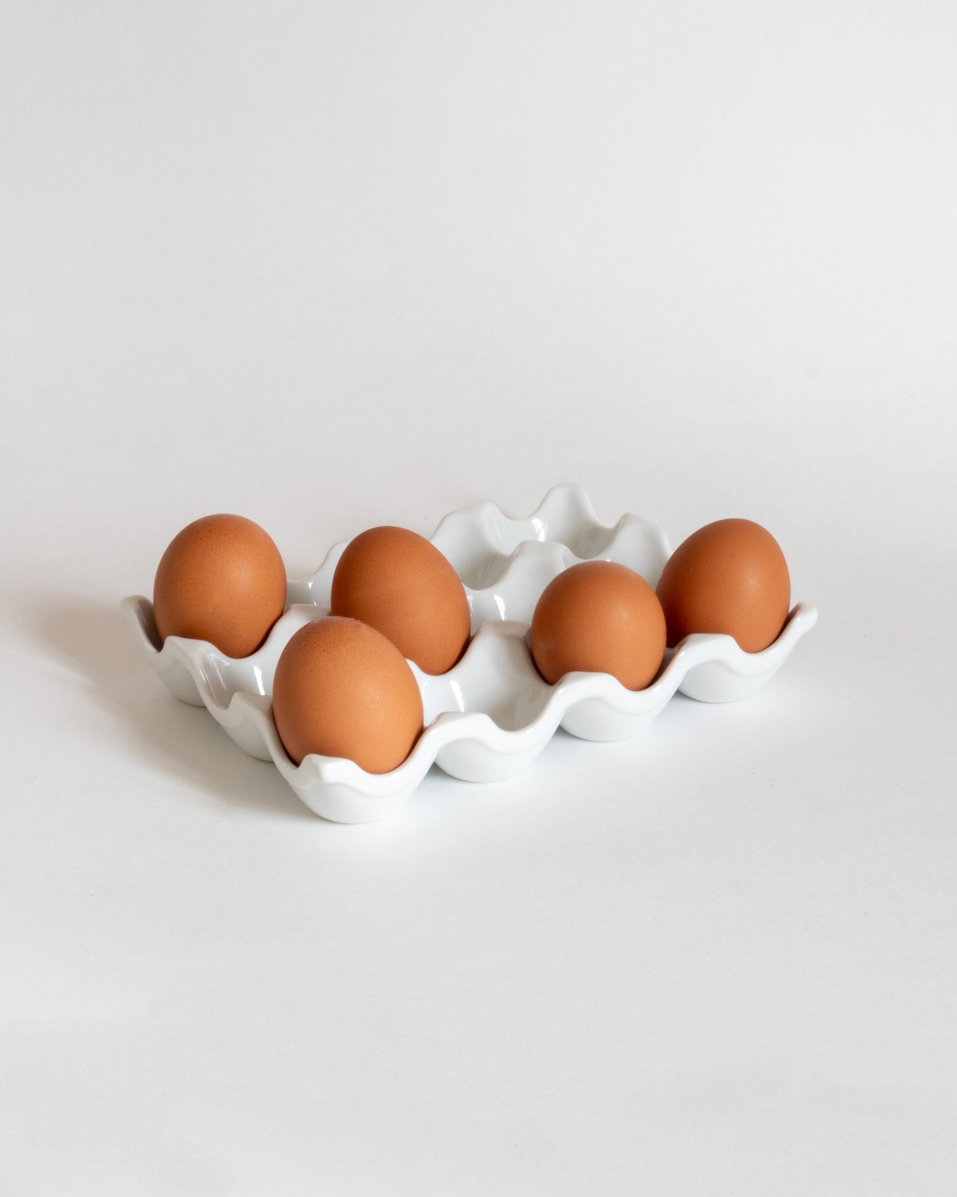 A porcelain egg crate designed to hold and organize a dozen eggs.