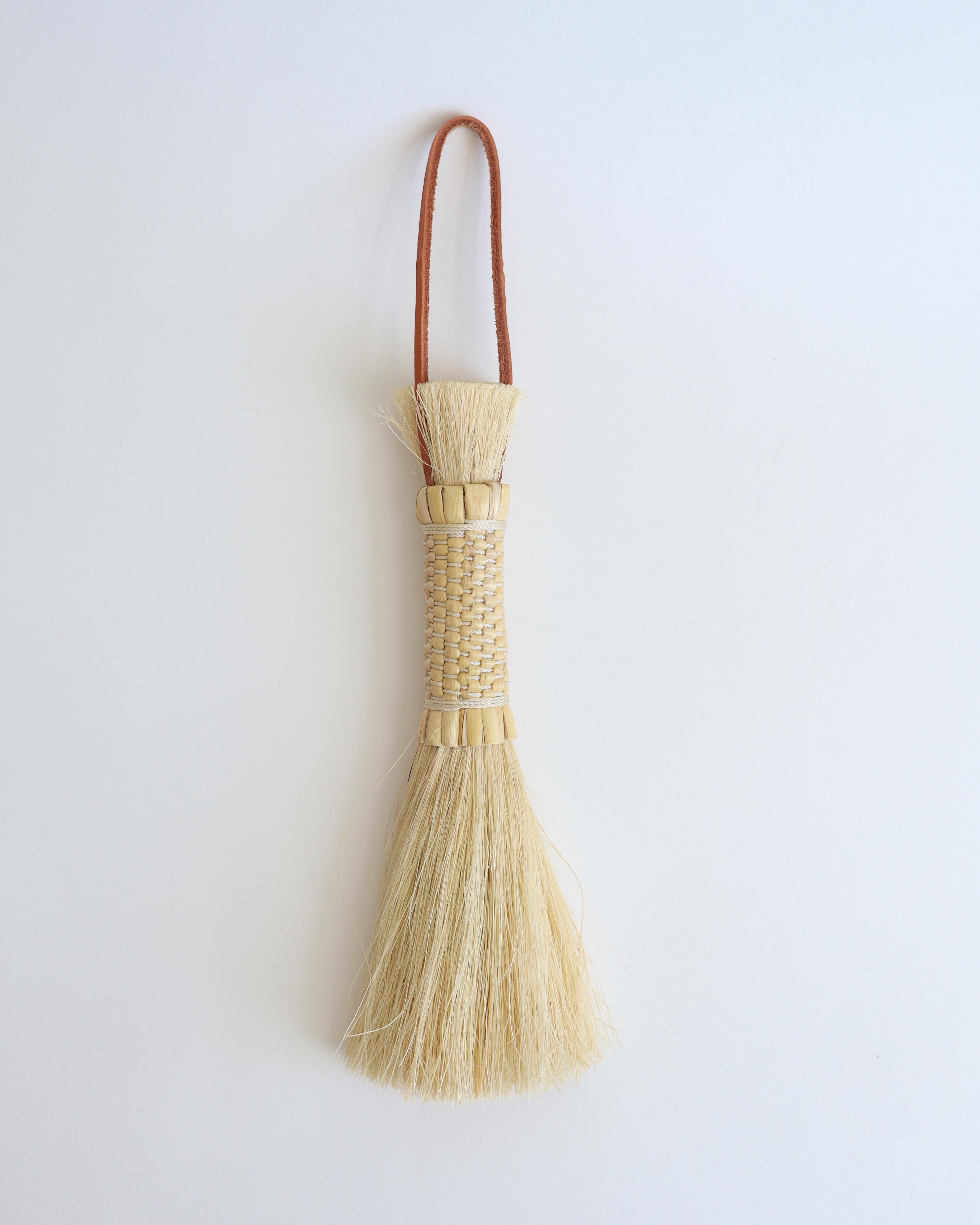 A soft hand brush made with tampico fiber and a broomcorn handle. Designed for light cleaning tasks.